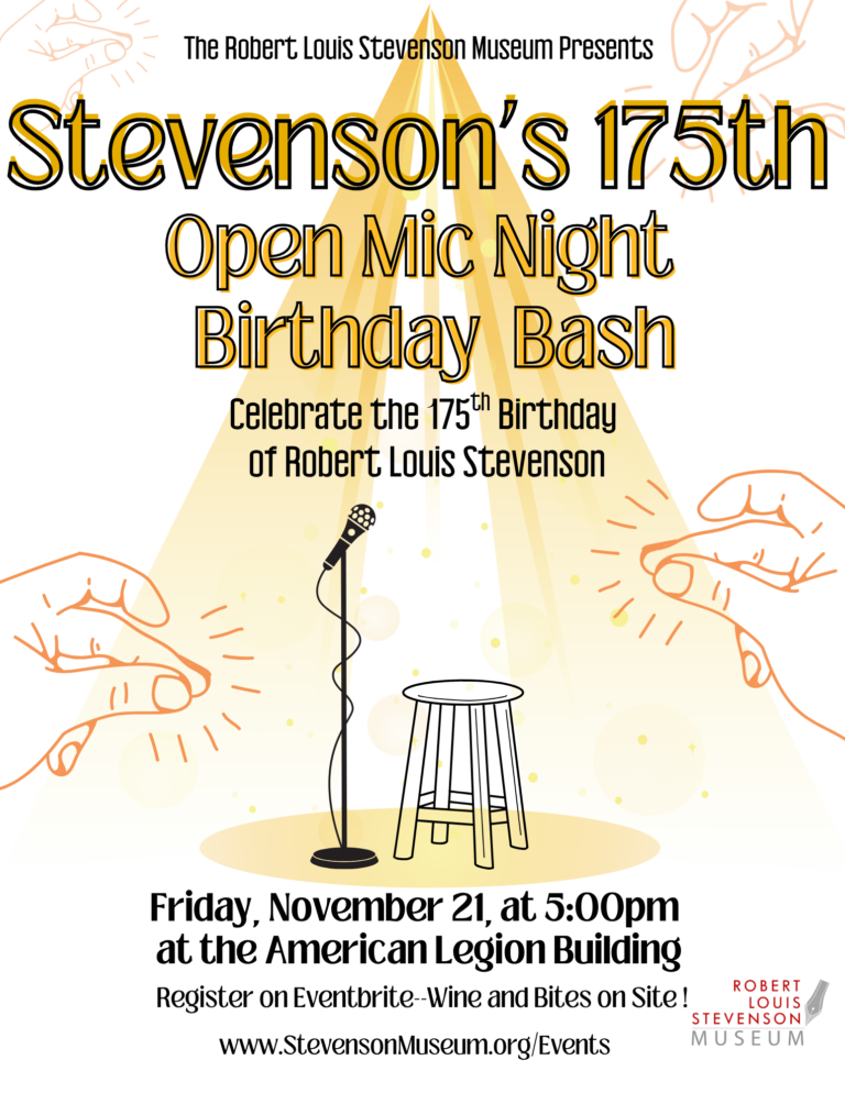 Come join us at the American Legion as we honor the legendary poet Robert Louis Stevenson on his 175th birthday! Come and recite your orginal poetry or share a favorite verse by Stevenson and others. Whether you’re a poetry enthusiast or just looking for a fun night out, join us in this special celebration of Stevenson’s life and work. See you there!